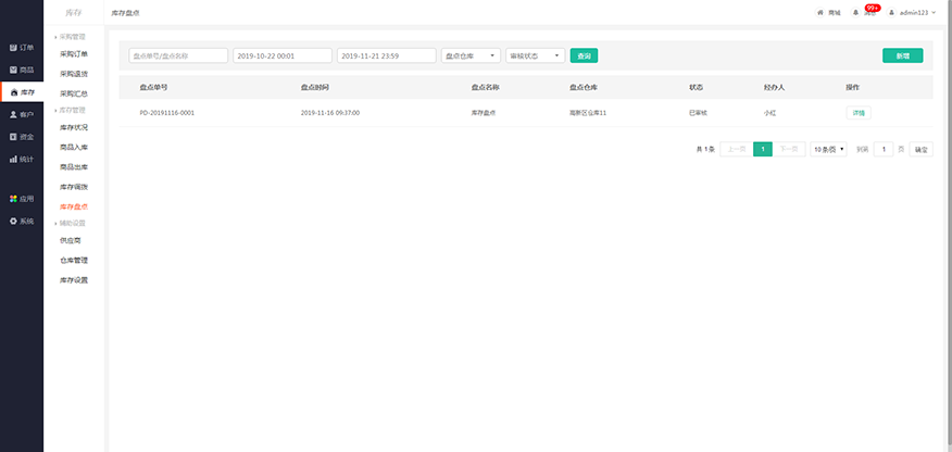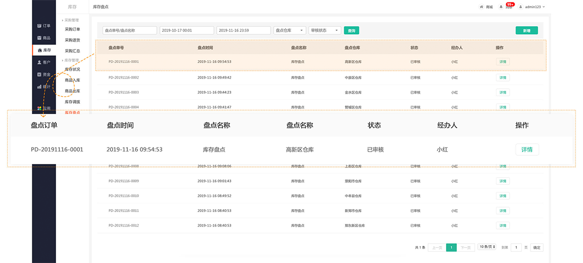 存:调拨单、盘点单,库存的每一次变动都有详细的账单记录,对照盘点单直接与实际库存进行对比即可。