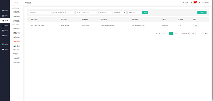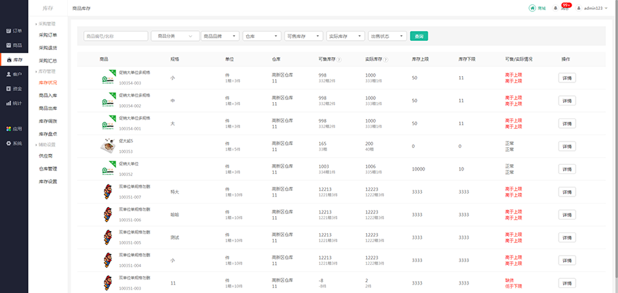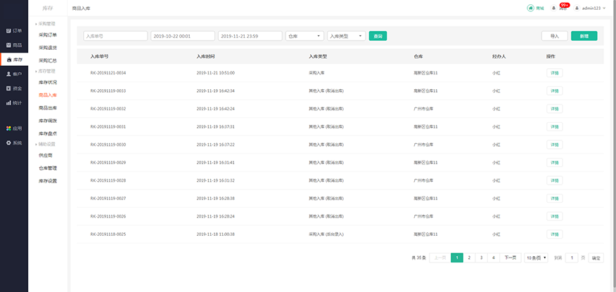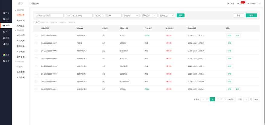 进:指货物的流入,采购订单、采购退货采购汇总、收货入库、付款记录、以及供应商、仓库、姓名、日期和详细的商品信息等等,每一个步骤系统都记录在账,便于查询、核销、管理;