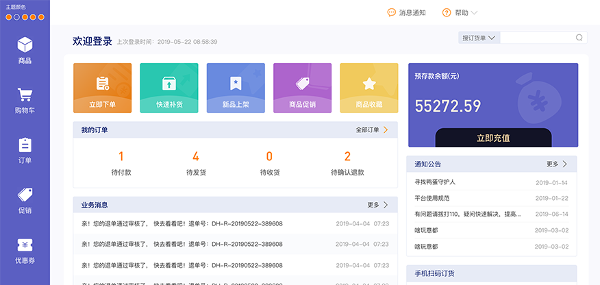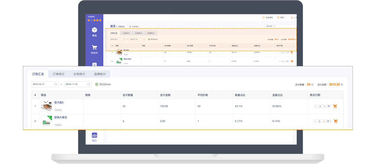 订货客户在订货APP可随时查看近期订货商品汇总,商品品牌、商品分类等统计数据,查看交易记录及预存款明细一目了然。